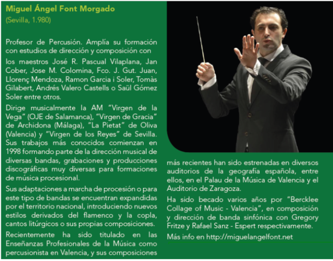 En esta ocasión, asistirá como director invitado, el Director y Compositor, Migue Angel Font Morgardo, que dirigirá el Concierto.