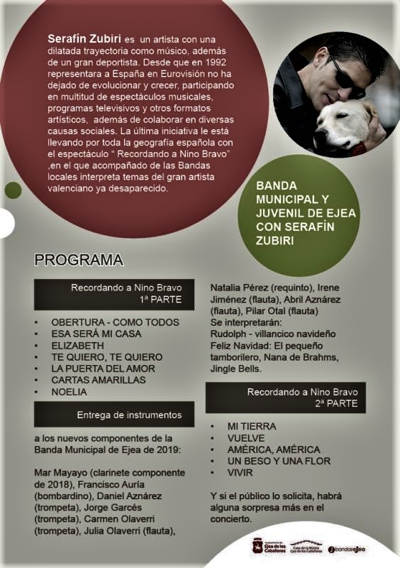 El Proximo 29 de Diciembre, a las 19,00 horas, en el Casino España de Ejea, Las Bandadas Municipal y Juvenil de Ejea, con Serafin Zubiri ofrecerán El Gran Concierto de Navidad 2019, recordando a Nino Bravo.