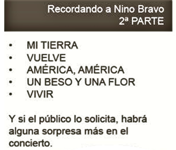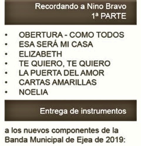 El Concierto se realizará como es habitual, desarollando el las dos partes temas de Nino Bravo, en el intermedio se hará entrega de instrumentos a los nuevos componentes de la Banda Municipal.