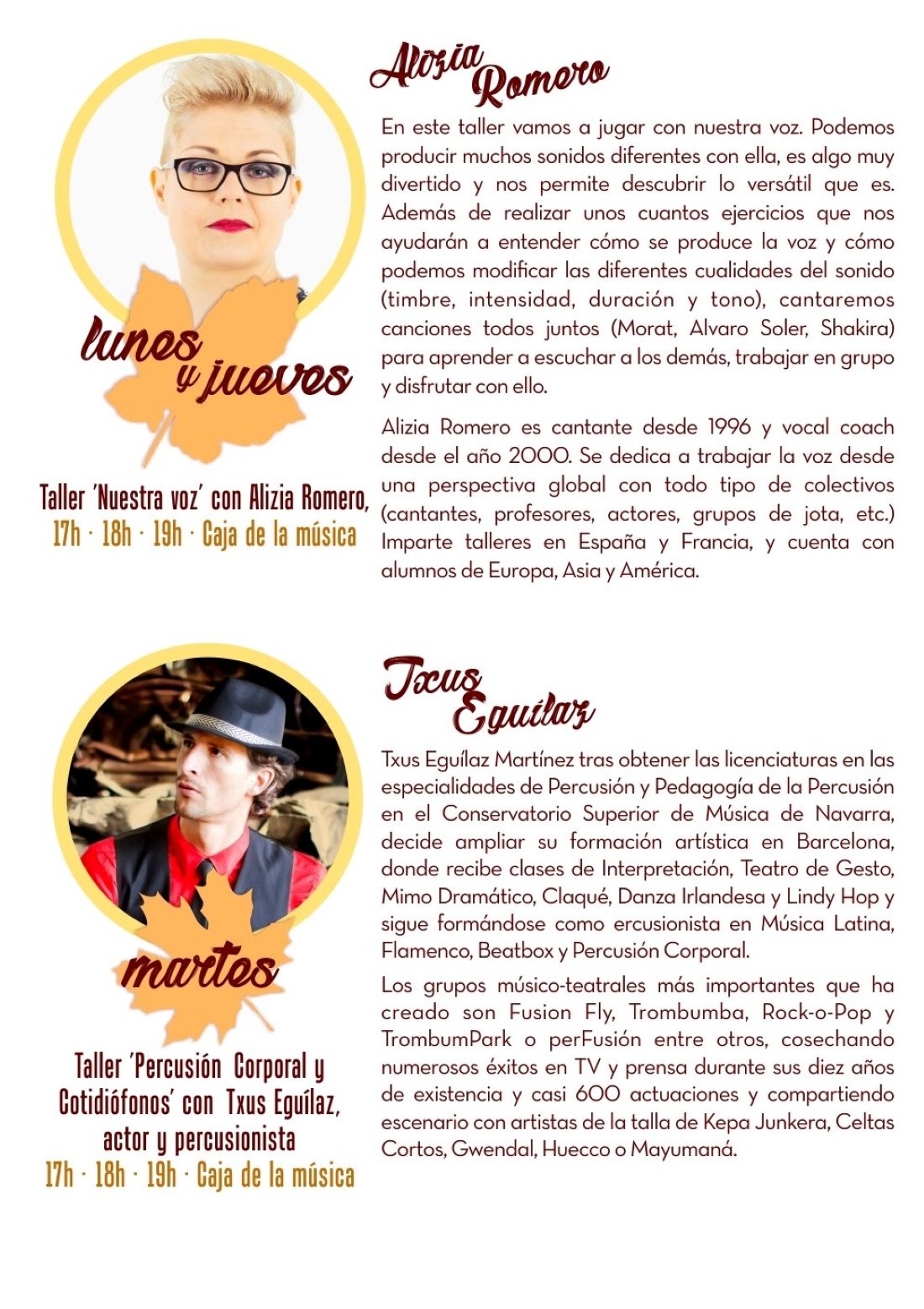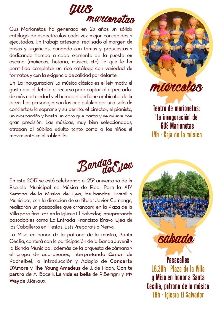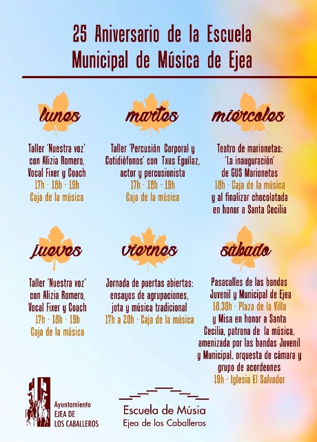 En dicha semana se desarrollaran Jornadas de diferentes Talleres  en la Casa de la Música, terminando el Sábado 25 con un Pasacalles realizado por las Banda Juvenil y Municipal, saliendo de la Plaza de la Villa a la Iglesia de El Salvador, a las 7,30 Horas Se Oficiará la Santa Misa en honor a Santa Cecilia, patrona de la Música y Amenizada por las Banda de Música, Orquesta de Cámara y Grupo de Acordeones de la Casa de la Música